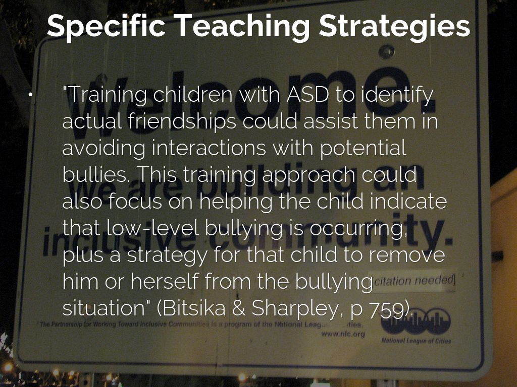 "Training children with ASD to identify actual friendships could assist them in avoiding interactions with potential bullies. This training approach could also focus on helping the child indicate that low-level bullying is occurring, plus a strategy for that child to remove him or herself from the bullying situation" (Bitsika & Sharpley, p 759).