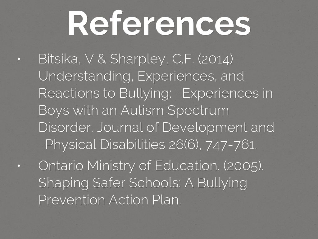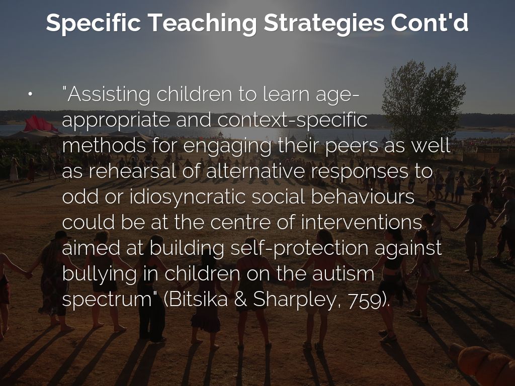 "Assisting children to learn age-appropriate and context-specific methods for engaging their peers as well as rehearsal of alternative responses to odd or idiosyncratic social behaviours could be at the centre of interventions aimed at building self-protection against bullying in children on the autism spectrum" (Bitsika & Sharpley, 759).