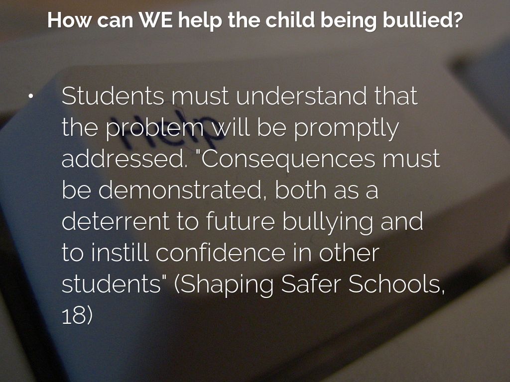 Students must understand that the problem will be promptly addressed. "Consequences must be demonstrated, both as a deterrent to future bullying and to instill confidence in other students" (Shaping Safer Schools, 18)