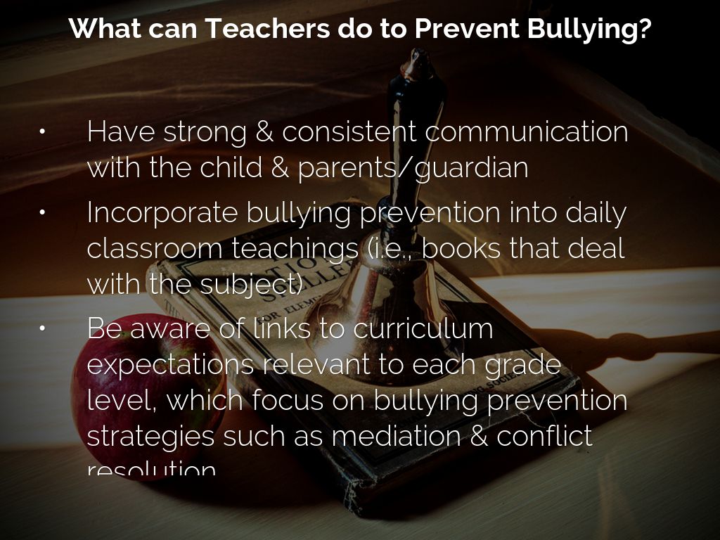 Be aware of links to curriculum expectations relevant to each grade level, which focus on bullying prevention strategies such as mediation & conflict resolution
