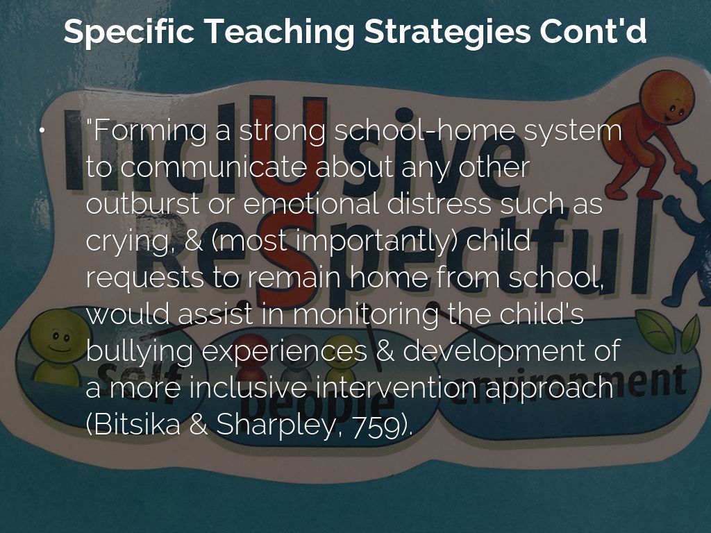 "Forming a strong school-home system to communicate about any other outburst or emotional distress such as crying, & (most importantly) child requests to remain home from school, would assist in monitoring the child's bullying experiences & development of a more inclusive intervention approach (Bitsika & Sharpley, 759).