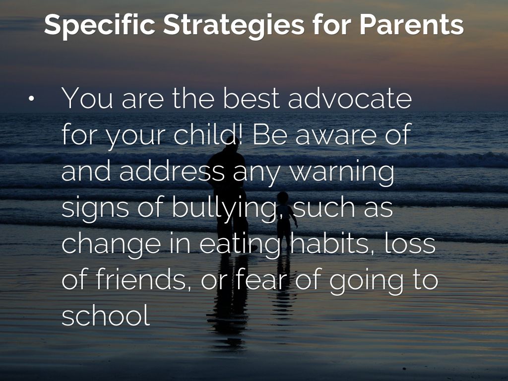 You are the best advocate for your child! Be aware of and address any warning signs of bullying, such as change in eating habits, loss of friends, or fear of going to school