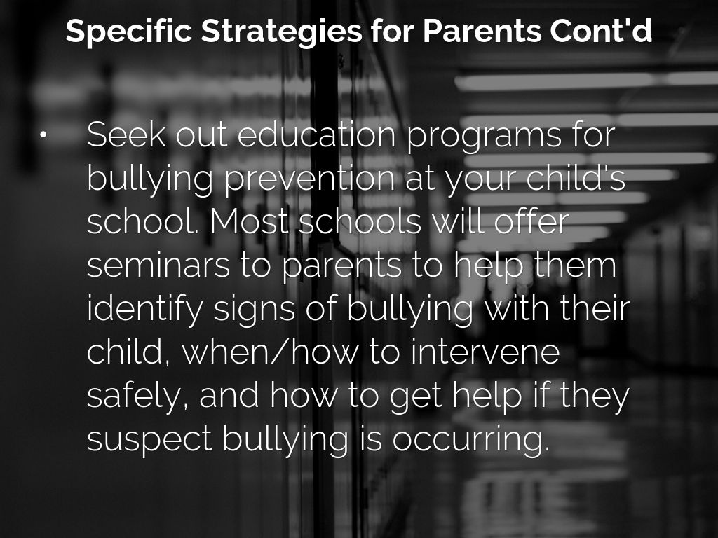 Seek out education programs for bullying prevention at your child's school. Most schools will offer seminars to parents to help them identify signs of bullying with their child, when/how to intervene safely, and how to get help if they suspect bullying is occurring.