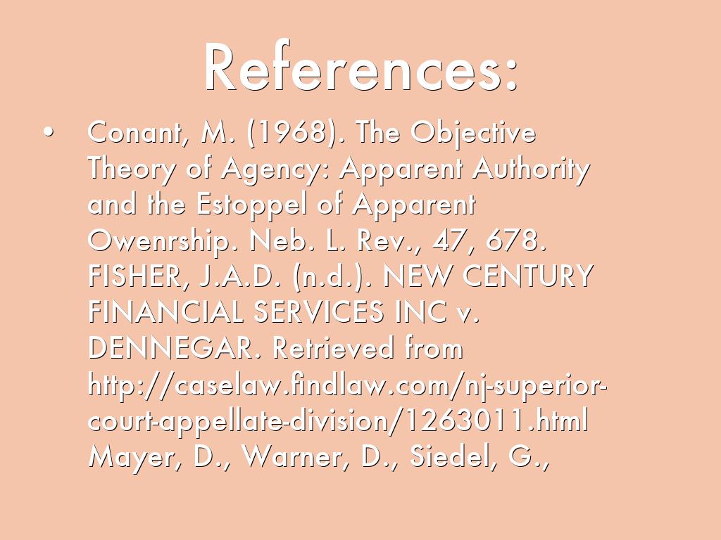 Conant, M. (1968). The Objective Theory of Agency: Apparent Authority and the Estoppel of Apparent Owenrship. Neb. L. Rev., 47, 678.
