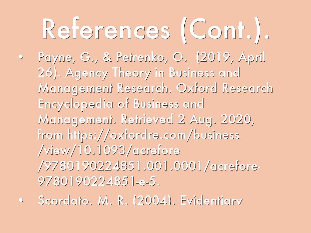 https://search.proquest.com/docview/208354049?accountid=33575 Payne, G., & Petrenko, O. (2019, April 26). Agency Theory in Business and Management Research. Oxford Research Encyclopedia of Business and Management. Retrieved 2 Aug. 2020, from