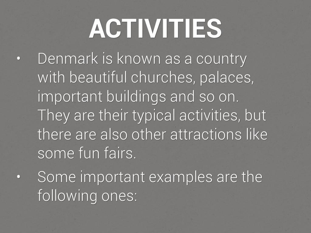 Denmark is known as a country with beautiful churches, palaces, important buildings and so on. They are their typical activities, but there are also other attractions like some fun fairs.