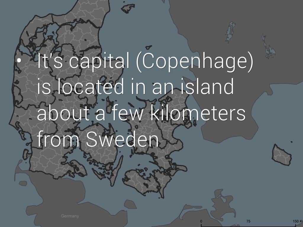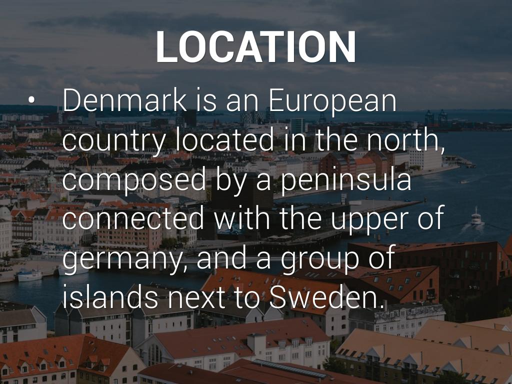 Denmark is an European country located in the north, composed by a peninsula connected with the upper of germany, and a group of islands next to Sweden.