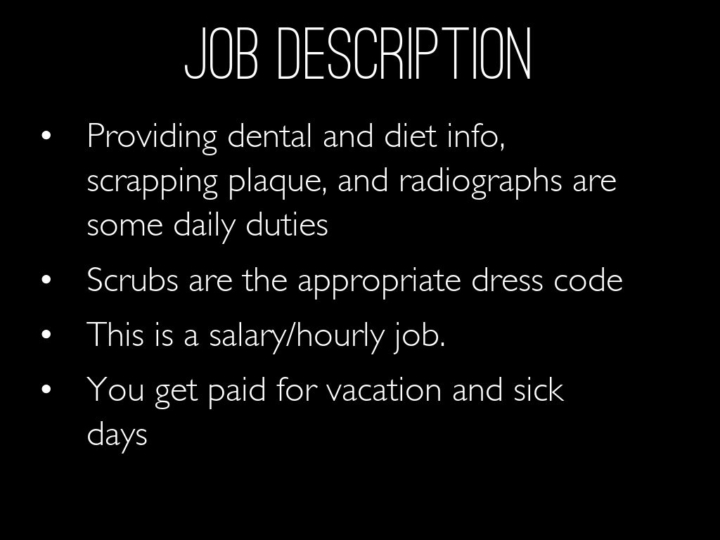 Providing dental and diet info, scrapping plaque, and radiographs are some daily duties