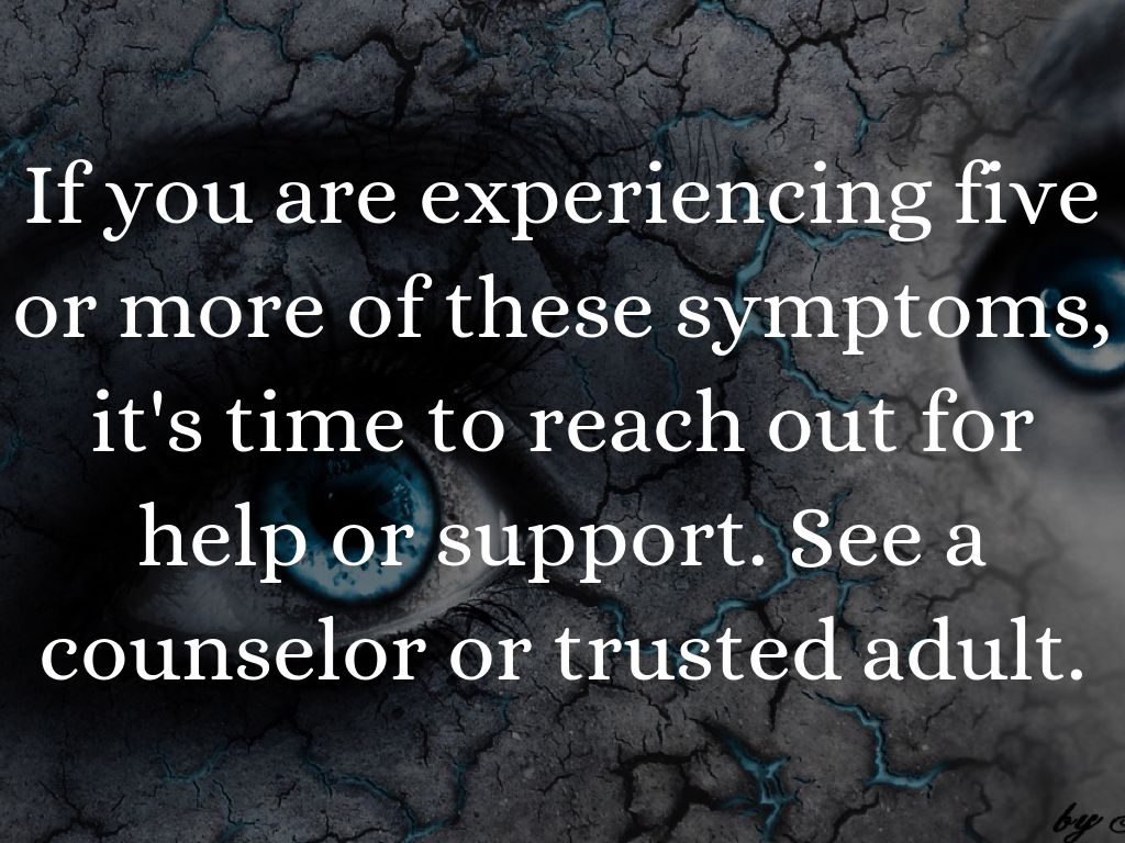 If you are experiencing five or more of these symptoms, it's time to reach out for help or support. See a counselor or trusted adult.