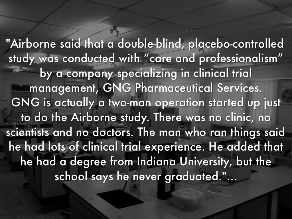 "Airborne said that a double-blind, placebo-controlled study was conducted with “care and professionalism” by a company specializing in clinical trial management, GNG Pharmaceutical Services. GNG is actually a two-man operation started up just to do the Airborne study. There was no clinic, no scientists and no doctors. The man who ran things said he had lots of clinical trial experience. He added that he had a degree from Indiana University, but the school says he never graduated."
