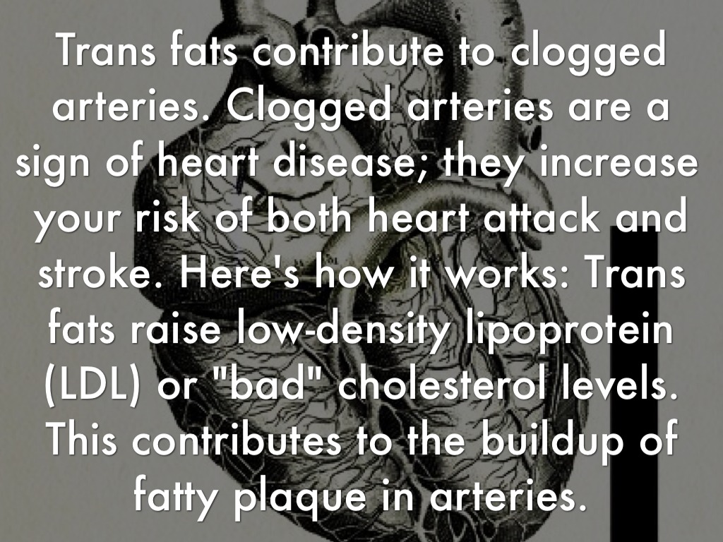 Trans fats contribute to clogged arteries. Clogged arteries are a sign of heart disease; they increase your risk of both heart attack and stroke. Here's how it works: Trans fats raise low-density lipoprotein (LDL) or "bad" cholesterol levels. This contributes to the buildup of fatty plaque in arteries.