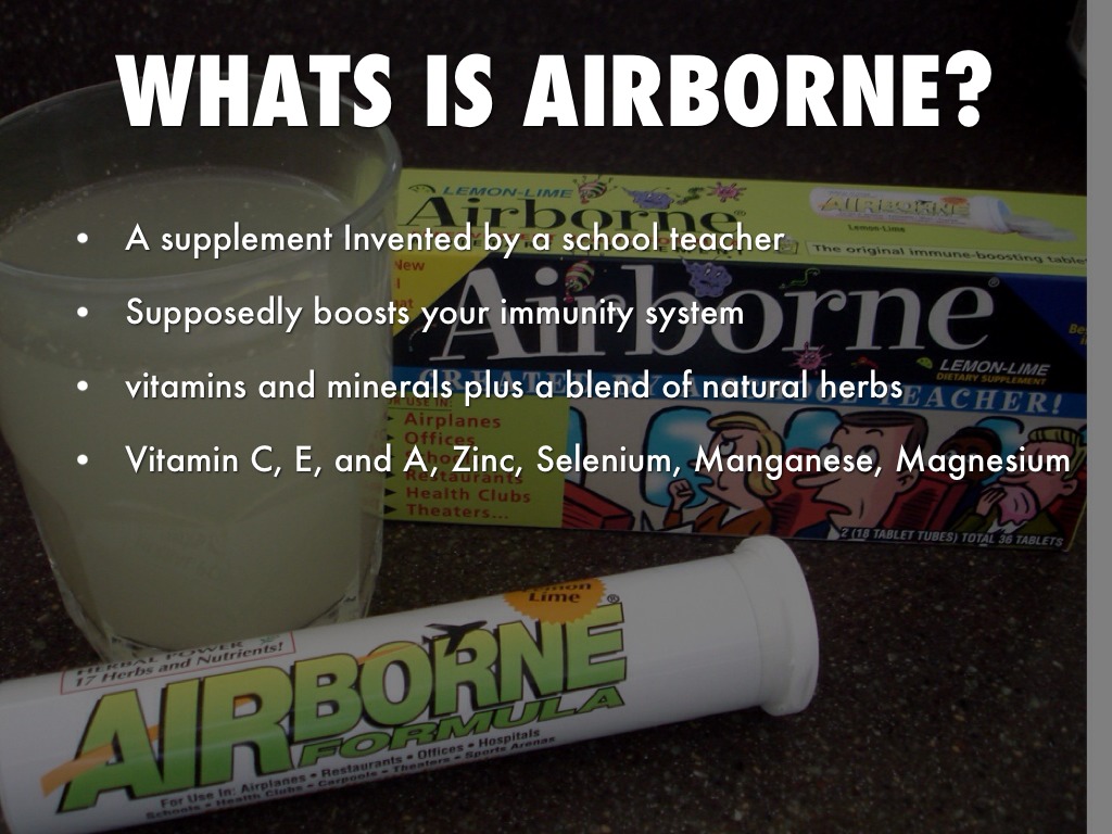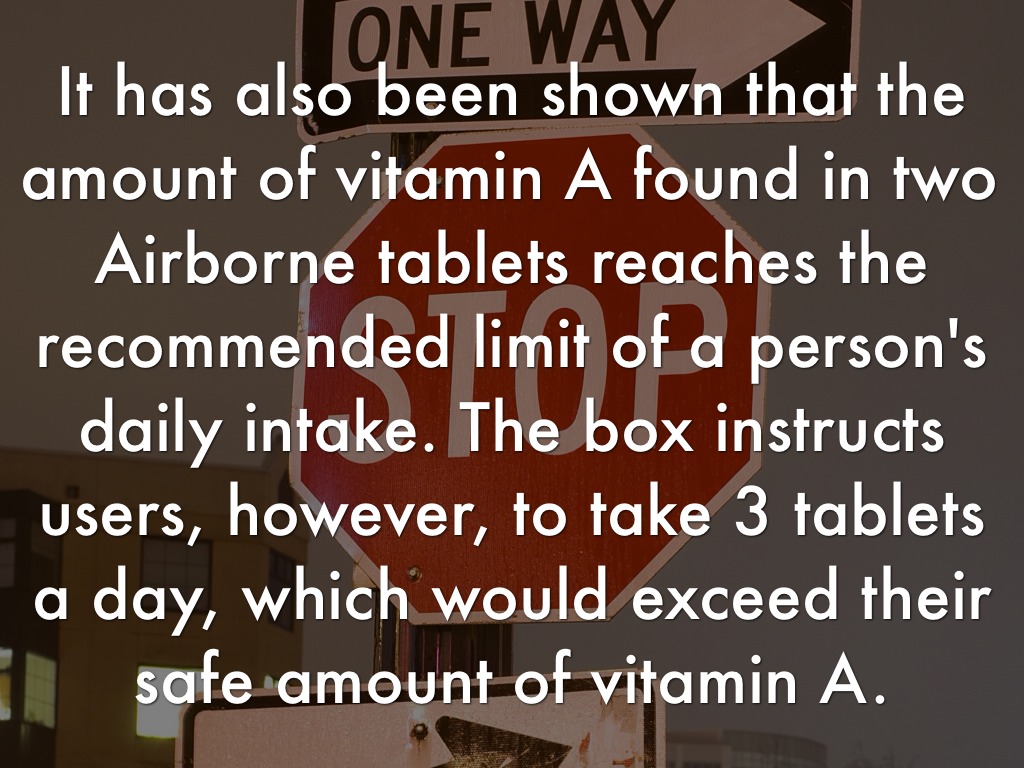 It has also been shown that the amount of vitamin A found in two Airborne tablets reaches the recommended limit of a person's daily intake. The box instructs users, however, to take 3 tablets a day, which would exceed their safe amount of vitamin A.