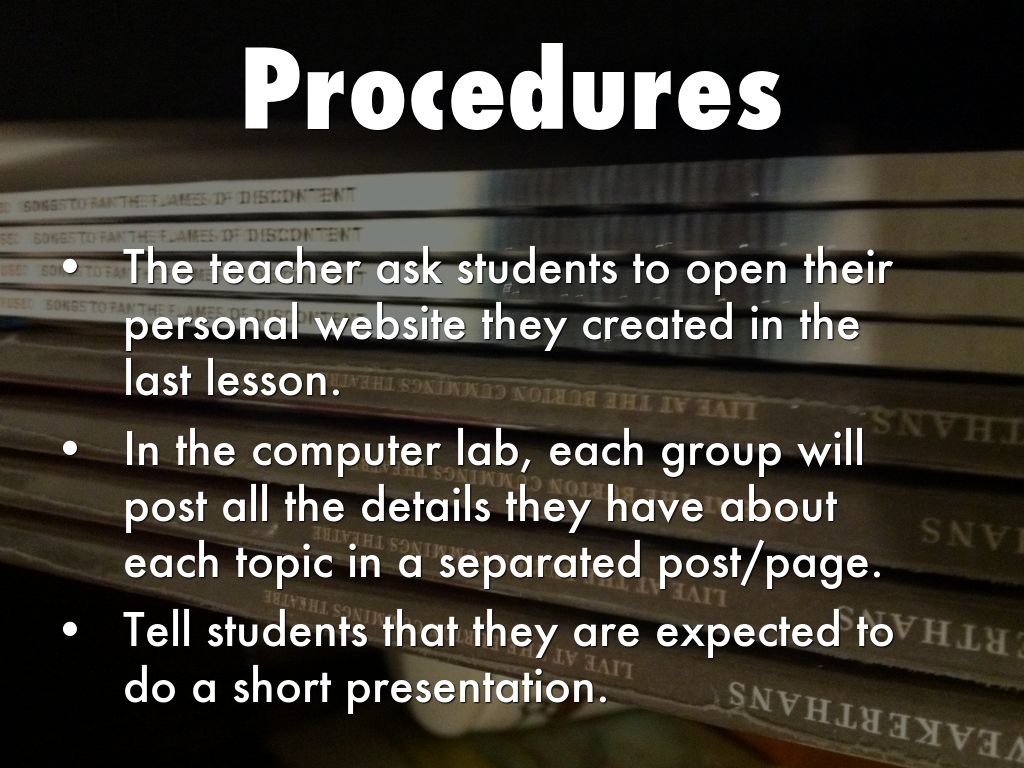 Materials and Resources: - Comupters that connect to the Internet. - Personal website tools (Blogspot, Google Sites...) - Projector. - Collected data.