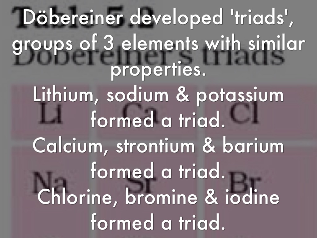 Döbereiner developed 'triads', groups of 3 elements with similar properties.