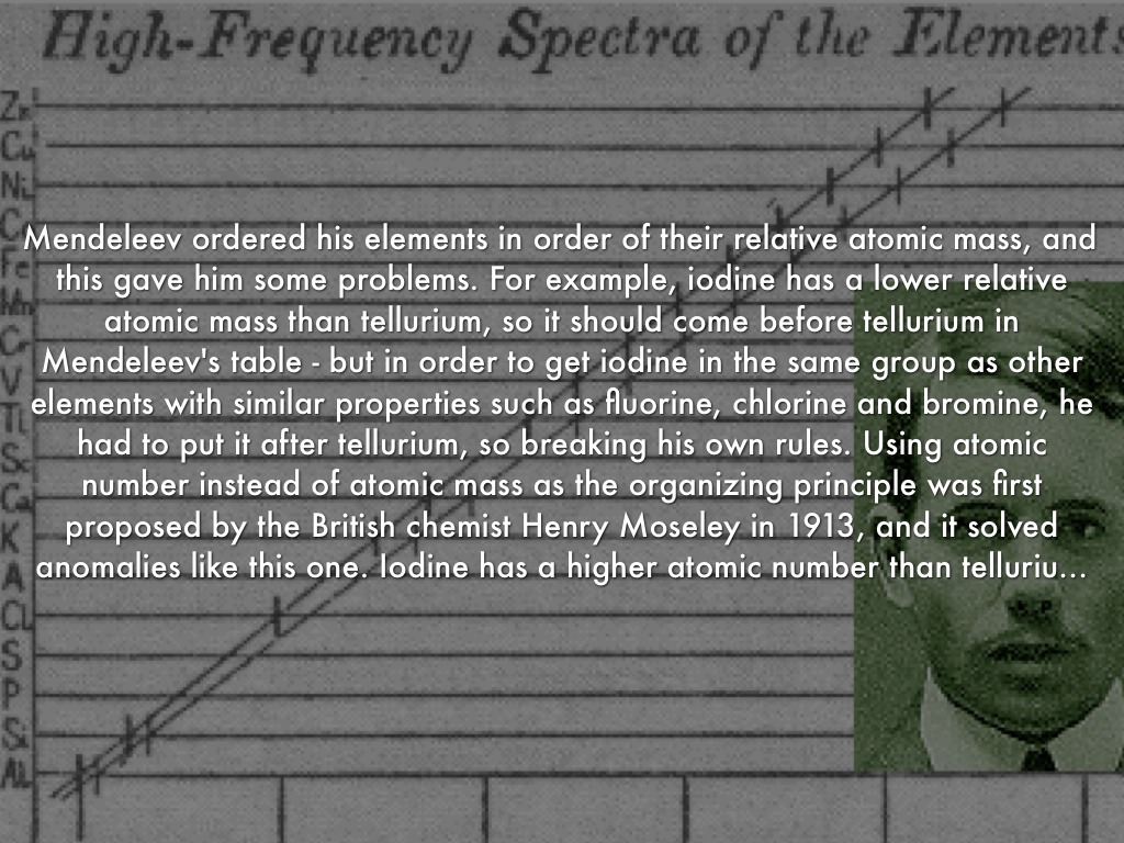 Mendeleev ordered his elements in order of their relative atomic mass, and this gave him some problems. For example, iodine has a lower relative atomic mass than tellurium, so it should come before tellurium in Mendeleev's table - but in order to get iodine in the same group as other elements with similar properties such as fluorine, chlorine and bromine, he had to put it after tellurium, so breaking his own rules. Using atomic number instead of atomic mass as the organizing principle was first proposed by the British chemist Henry Moseley in 1913, and it solved anomalies like this one. Iodine has a higher atomic number than tellurium.