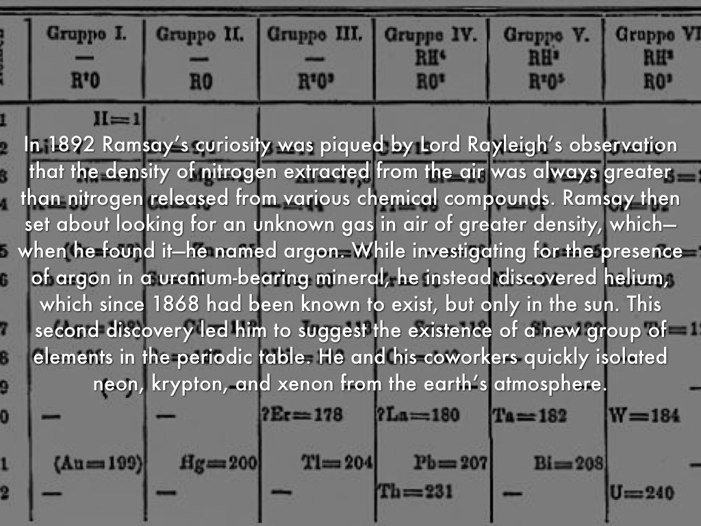 In 1892 Ramsay’s curiosity was piqued by Lord Rayleigh’s observation that the density of nitrogen extracted from the air was always greater than nitrogen released from various chemical compounds. Ramsay then set about looking for an unknown gas in air of greater density, which—when he found it—he named argon. While investigating for the presence of argon in a uranium-bearing mineral, he instead discovered helium, which since 1868 had been known to exist, but only in the sun. This second discovery led him to suggest the existence of a new group of elements in the periodic table. He and his coworkers quickly isolated neon, krypton, and xenon from the earth’s atmosphere.