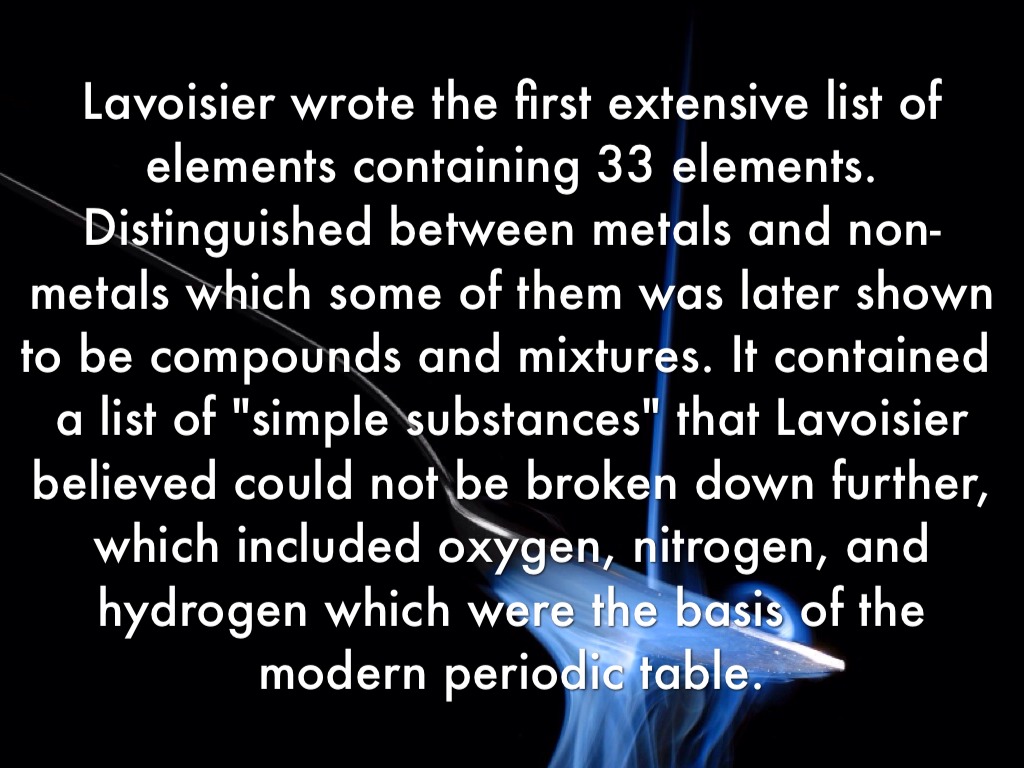 Distinguished between metals and non-metals which some of them was later shown to be compounds and mixtures. It contained a list of "simple substances" that Lavoisier believed could not be broken down further, which included oxygen, nitrogen, and hydrogen which were the basis of the modern periodic table.