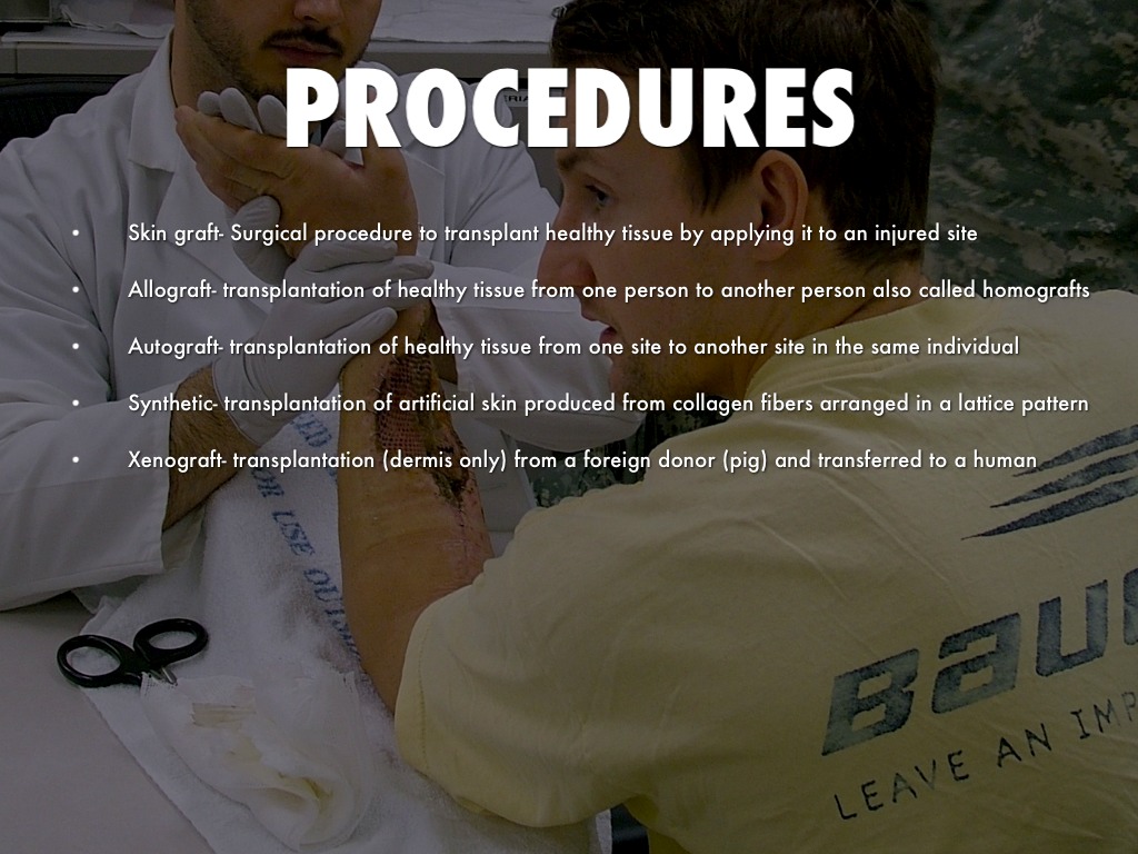 • Skin graft- Surgical procedure to transplant healthy tissue by applying it to an injured site