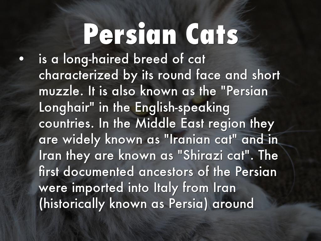 • is a long-haired breed of cat characterized by its round face and short muzzle. It is also known as the "Persian Longhair" in the English-speaking countries. In the Middle East region they are widely known as "Iranian cat" and in Iran they are known as "Shirazi cat". The first documented ancestors of the Persian were imported into Italy from Iran (historically known as Persia) around 1620.[1] The exact history of the Persian cat does seem to be a bit of a mystery but many of these long-haired cats were seen in hieroglyphics. The story has it that these long-haired cats were then imported into Europe as their popularity grew and breeding took place in Italy and France.