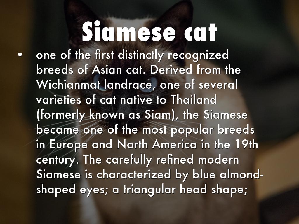 • one of the first distinctly recognized breeds of Asian cat. Derived from the Wichianmat landrace, one of several varieties of cat native to Thailand (formerly known as Siam), the Siamese became one of the most popular breeds in Europe and North America in the 19th century. The carefully refined modern Siamese is characterized by blue almond-shaped eyes; a triangular head shape; large ears; an elongated, slender, and muscular body; and point