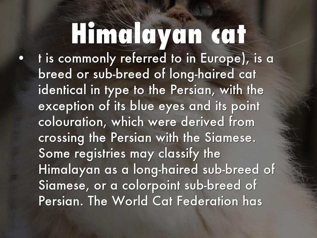 • t is commonly referred to in Europe), is a breed or sub-breed of long-haired cat identical in type to the Persian, with the exception of its blue eyes and its point colouration, which were derived from crossing the Persian with the Siamese. Some registries may classify the Himalayan as a long-haired sub-breed of Siamese, or a colorpoint sub-breed of Persian. The World Cat Federation has merged them with the