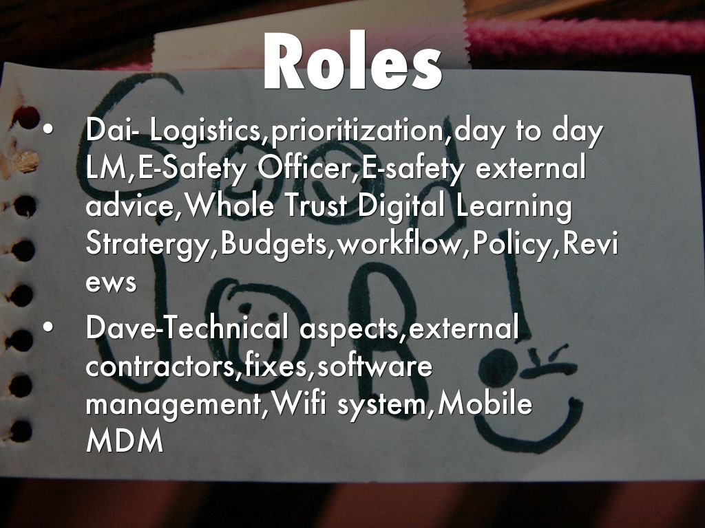 Dai- Logistics,prioritization,day to day LM,E-Safety Officer,E-safety external advice,Whole Trust Digital Learning Stratergy,Budgets,workflow,Policy,Reviews