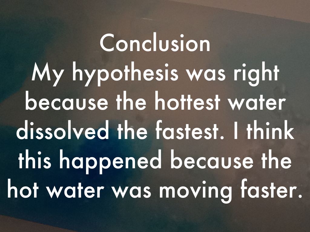 My hypothesis was right because the hottest water dissolved the fastest. I think this happened because the hot water was moving faster.