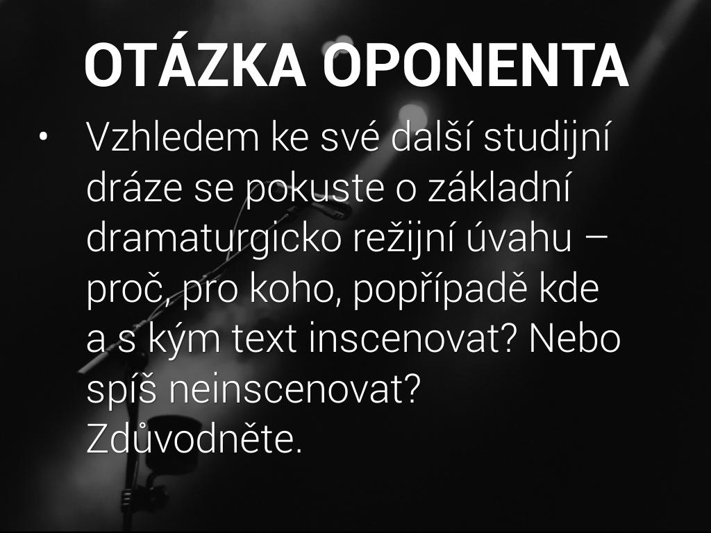 • Vzhledem ke své další studijní dráze se pokuste o základní dramaturgicko režijní úvahu – proč, pro koho, popřípadě kde a s kým text inscenovat? Nebo spíš neinscenovat? Zdůvodněte.