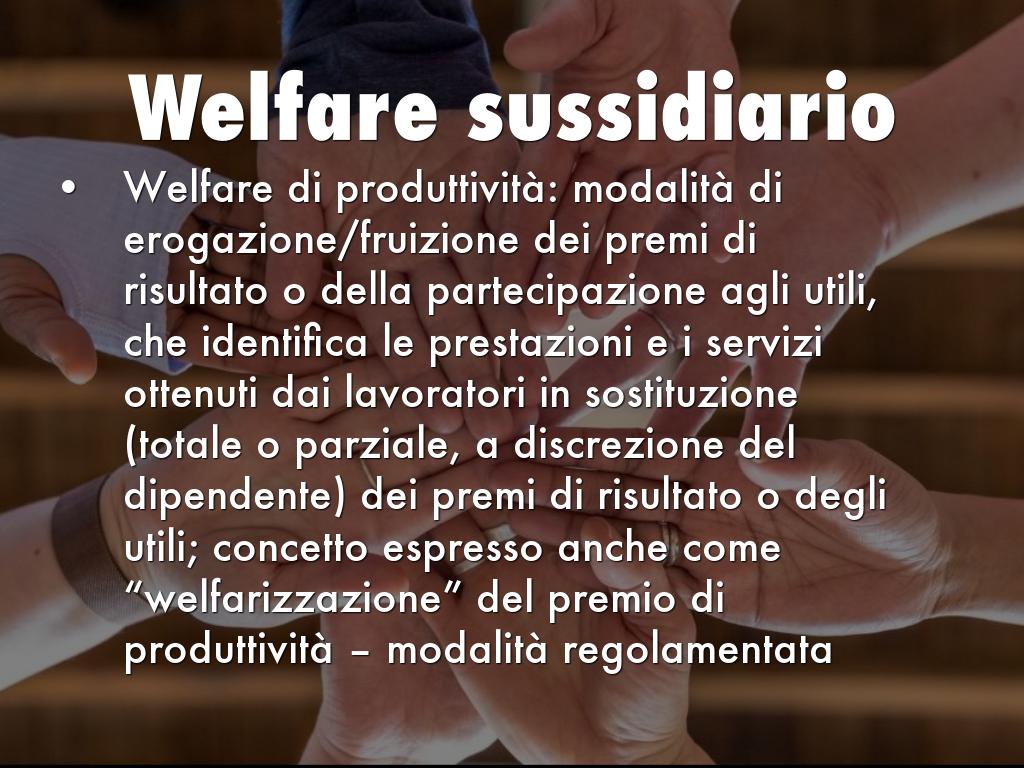 Welfare di produttività: modalità di erogazione/fruizione dei premi di risultato o della partecipazione agli utili, che identifica le prestazioni e i servizi ottenuti dai lavoratori in sostituzione (totale o parziale, a discrezione del dipendente) dei premi di risultato o degli utili; concetto espresso anche come “welfarizzazione” del premio di produttività – modalità regolamentata dalla contrattazione collettiva