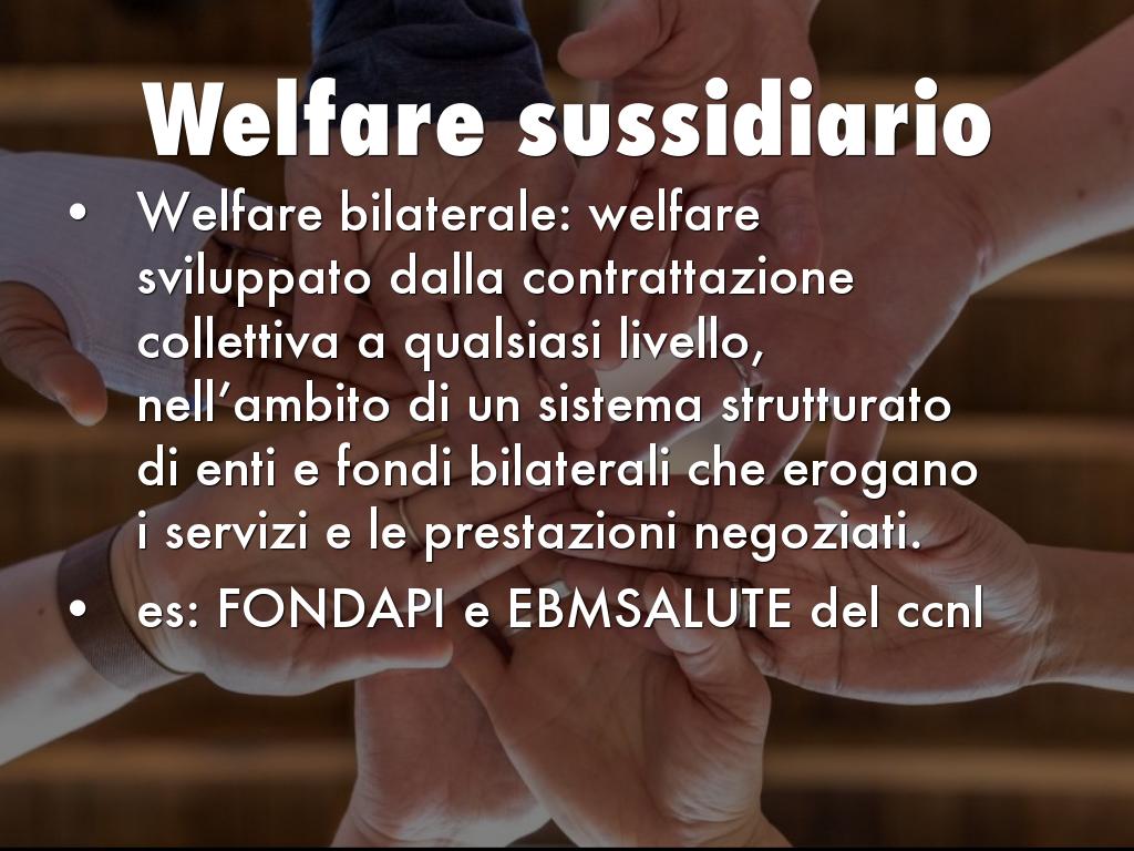 Welfare bilaterale: welfare sviluppato dalla contrattazione collettiva a qualsiasi livello, nell’ambito di un sistema strutturato di enti e fondi bilaterali che erogano i servizi e le prestazioni negoziati.