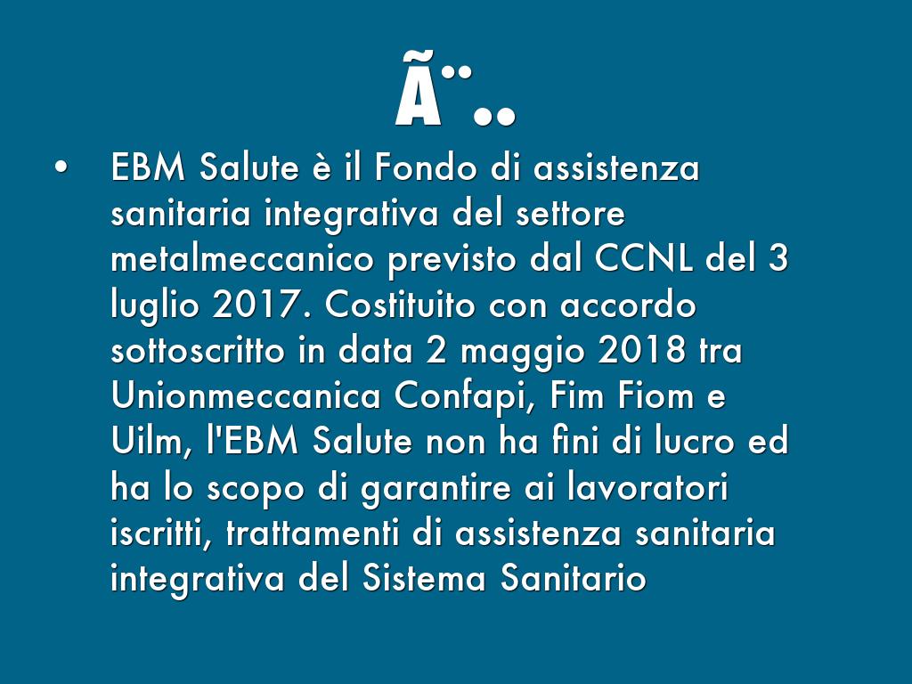 EBM Salute è il Fondo di assistenza sanitaria integrativa del settore metalmeccanico previsto dal CCNL del 3 luglio 2017. Costituito con accordo sottoscritto in data 2 maggio 2018 tra Unionmeccanica Confapi, Fim Fiom e Uilm, l'EBM Salute non ha fini di lucro ed ha lo scopo di garantire ai lavoratori iscritti, trattamenti di assistenza sanitaria integrativa del Sistema Sanitario Nazionale secondo le modalità, i requisiti e le condizioni previsti dal Regolamento.