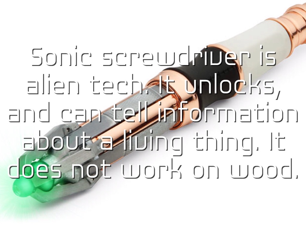 Sonic screwdriver is alien tech. It unlocks, and can tell information about a living thing. It does not work on wood.