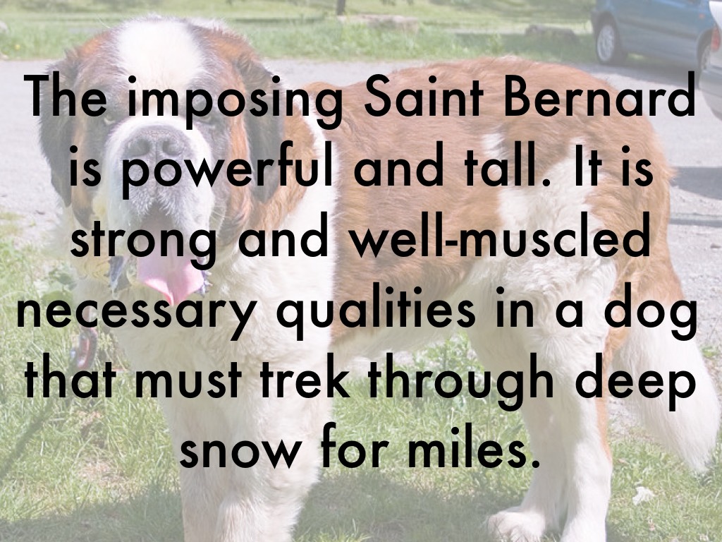 The imposing Saint Bernard is powerful and tall. It is strong and well-muscled necessary qualities in a dog that must trek through deep snow for miles.