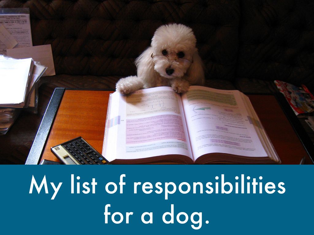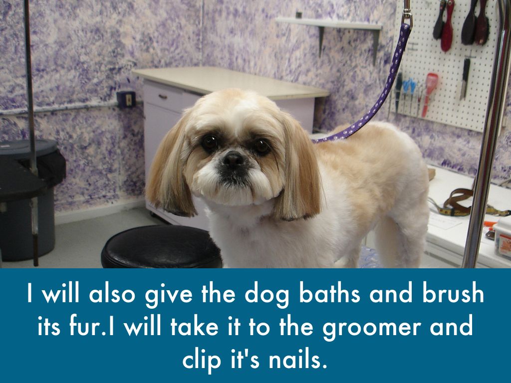 I will also give the dog baths and brush its fur.I will take it to the groomer and clip it's nails.