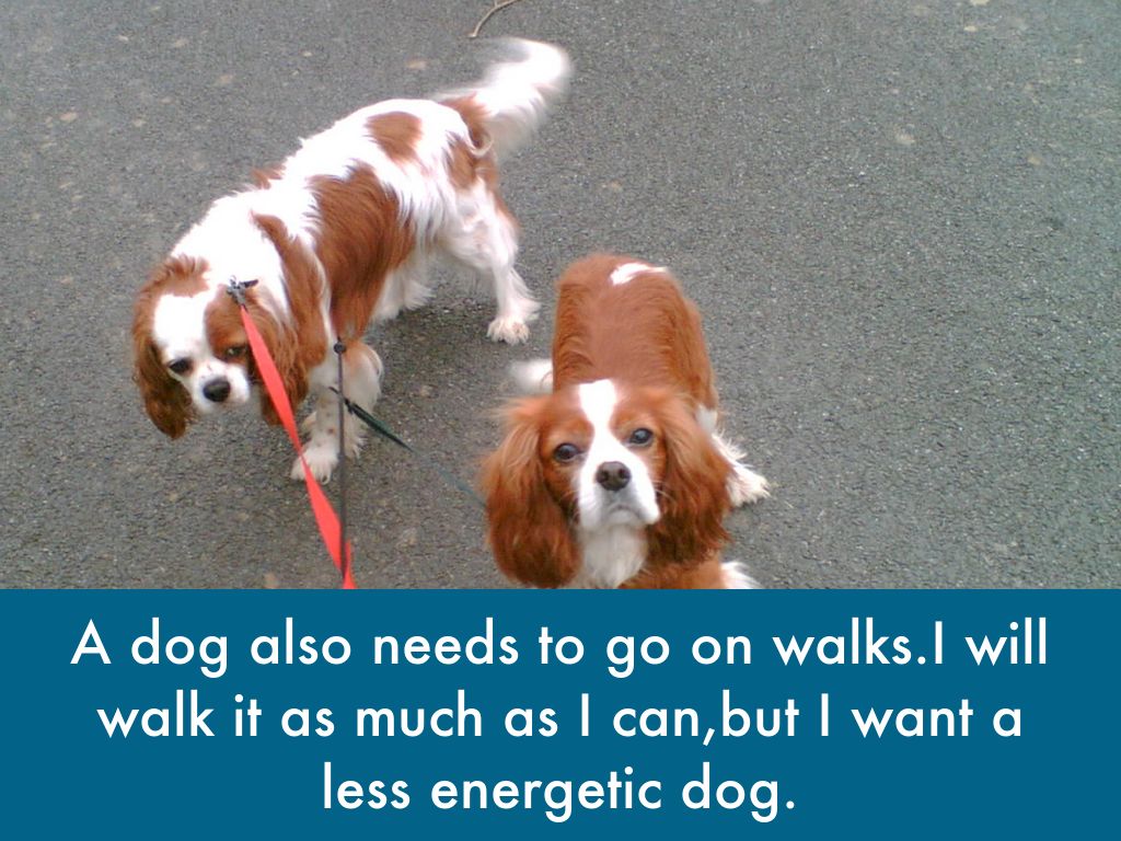 A dog also needs to go on walks.I will walk it as much as I can,but I want a less energetic dog.