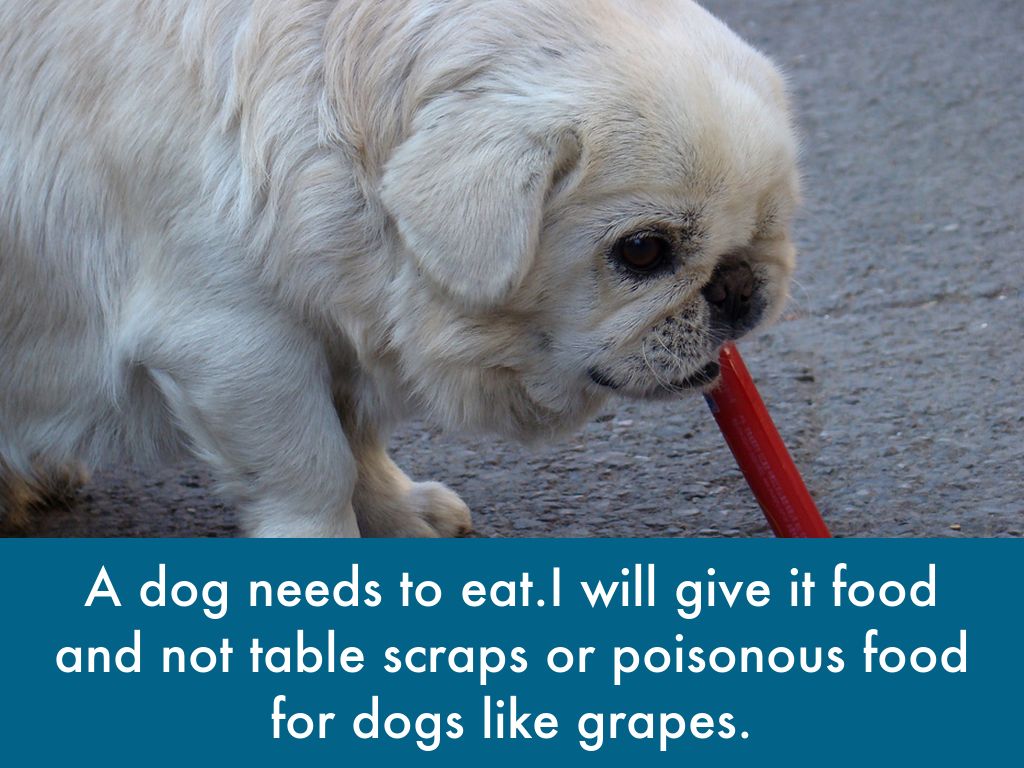 A dog needs to eat.I will give it food and not table scraps or poisonous food for dogs like grapes.