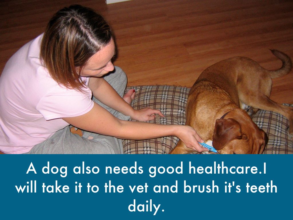 A dog also needs good healthcare.I will take it to the vet and brush it's teeth daily.