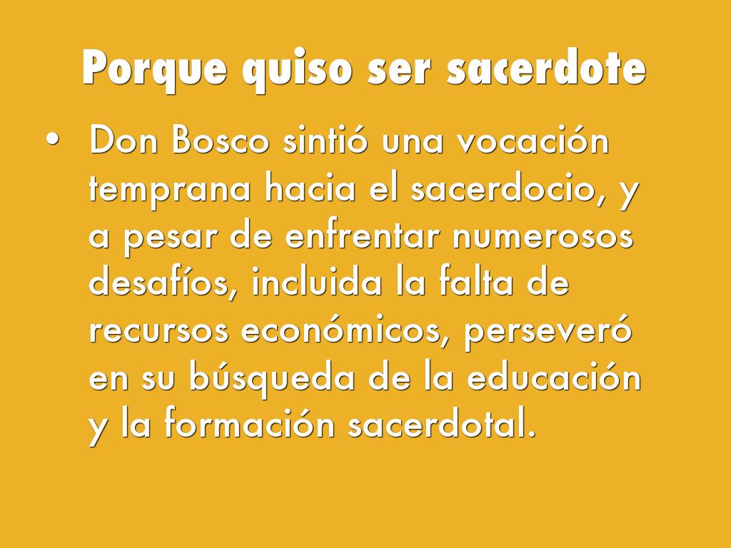 Don Bosco sintió una vocación temprana hacia el sacerdocio, y a pesar de enfrentar numerosos desafíos, incluida la falta de recursos económicos, perseveró en su búsqueda de la educación y la formación sacerdotal.
