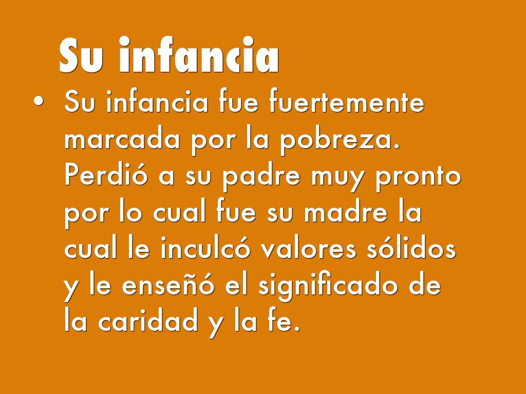 Su infancia fue fuertemente marcada por la pobreza. Perdió a su padre muy pronto por lo cual fue su madre la cual le inculcó valores sólidos y le enseñó el significado de la caridad y la fe.