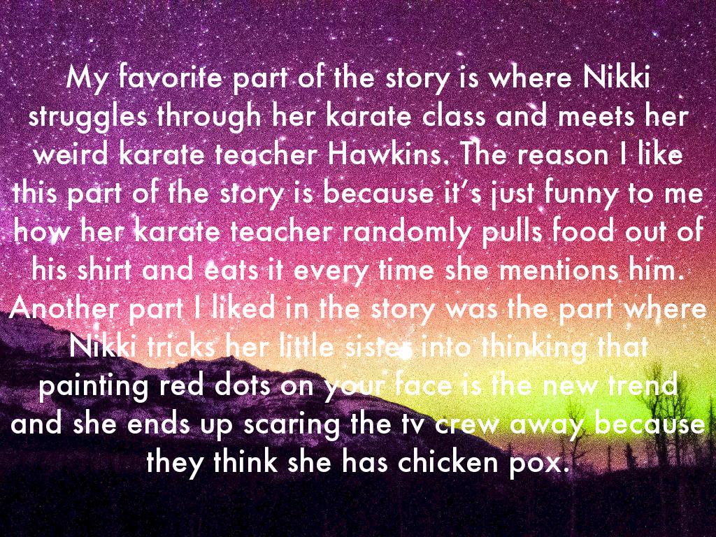 My favorite part of the story is where Nikki struggles through her karate class and meets her weird karate teacher Hawkins. The reason I like this part of the story is because it’s just funny to me how her karate teacher randomly pulls food out of his shirt and eats it every time she mentions him. Another part I liked in the story was the part where Nikki tricks her little sister into thinking that painting red dots on your face is the new trend and she ends up scaring the tv crew away because they think she has chicken pox.
