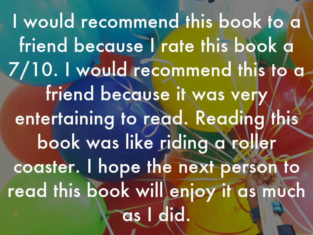I would recommend this book to a friend because I rate this book a 7/10. I would recommend this to a friend because it was very entertaining to read. Reading this book was like riding a roller coaster. I hope the next person to read this book will enjoy it as much as I did.