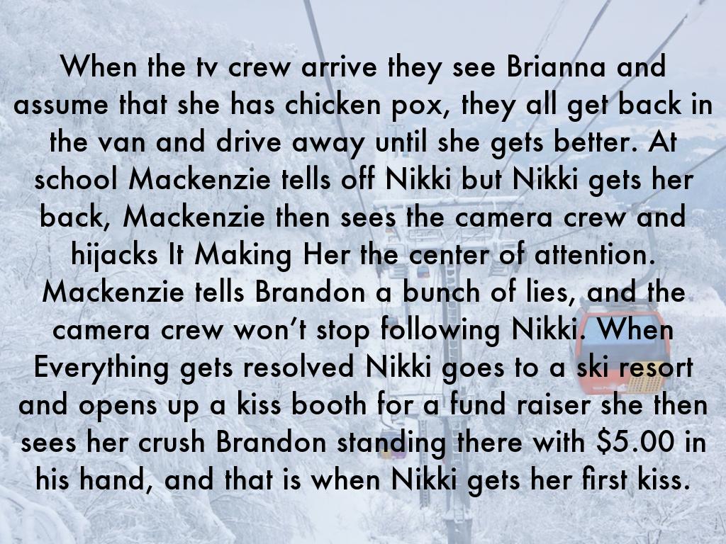 When the tv crew arrive they see Brianna and assume that she has chicken pox, they all get back in the van and drive away until she gets better. At school Mackenzie tells off Nikki but Nikki gets her back, Mackenzie then sees the camera crew and hijacks It Making Her the center of attention. Mackenzie tells Brandon a bunch of lies, and the camera crew won’t stop following Nikki. When Everything gets resolved Nikki goes to a ski resort and opens up a kiss booth for a fund raiser she then sees her crush Brandon standing there with $5.00 in his hand, and that is when Nikki gets her first kiss.
