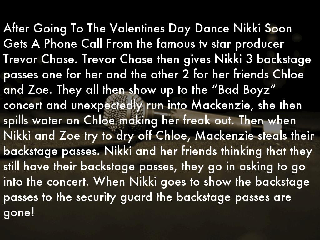 After Going To The Valentines Day Dance Nikki Soon Gets A Phone Call From the famous tv star producer Trevor Chase. Trevor Chase then gives Nikki 3 backstage passes one for her and the other 2 for her friends Chloe and Zoe. They all then show up to the “Bad Boyz” concert and unexpectedly run into Mackenzie, she then spills water on Chloe making her freak out. Then when Nikki and Zoe try to dry off Chloe, Mackenzie steals their backstage passes. Nikki and her friends thinking that they still have their backstage passes, they go in asking to go into the concert. When Nikki goes to show the backstage passes to the security guard the backstage passes are gone!