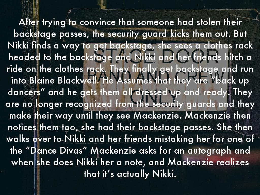 After trying to convince that someone had stolen their backstage passes, the security guard kicks them out. But Nikki finds a way to get backstage, she sees a clothes rack headed to the backstage and Nikki and her friends hitch a ride on the clothes rack. They finally get backstage and run into Blaine Blackwell. He Assumes that they are “back up dancers” and he gets them all dressed up and ready. They are no longer recognized from the security guards and they make their way until they see Mackenzie. Mackenzie then notices them too, she had their backstage passes. She then walks over to Nikki and her friends mistaking her for one of the “Dance Divas” Mackenzie asks for an autograph and when she does Nikki her a note, and Mackenzie realizes that it’s actually Nikki.
