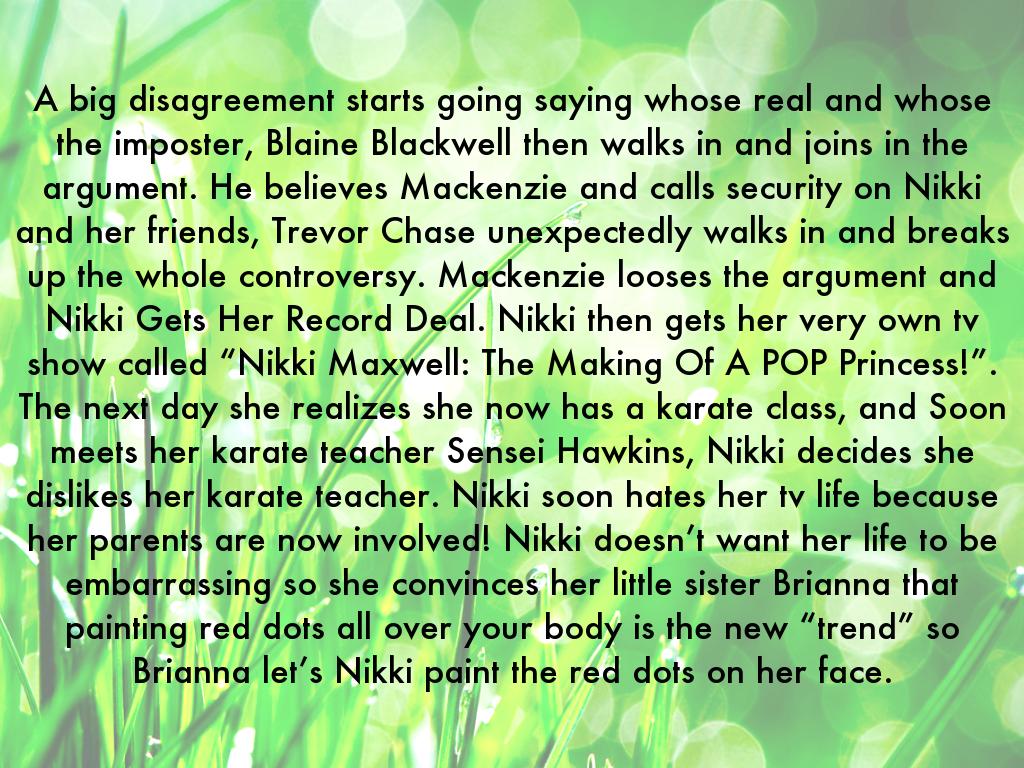 A big disagreement starts going saying whose real and whose the imposter, Blaine Blackwell then walks in and joins in the argument. He believes Mackenzie and calls security on Nikki and her friends, Trevor Chase unexpectedly walks in and breaks up the whole controversy. Mackenzie looses the argument and Nikki Gets Her Record Deal. Nikki then gets her very own tv show called “Nikki Maxwell: The Making Of A POP Princess!”. The next day she realizes she now has a karate class, and Soon meets her karate teacher Sensei Hawkins, Nikki decides she dislikes her karate teacher. Nikki soon hates her tv life because her parents are now involved! Nikki doesn’t want her life to be embarrassing so she convinces her little sister Brianna that painting red dots all over your body is the new “trend” so Brianna let’s Nikki paint the red dots on her face.
