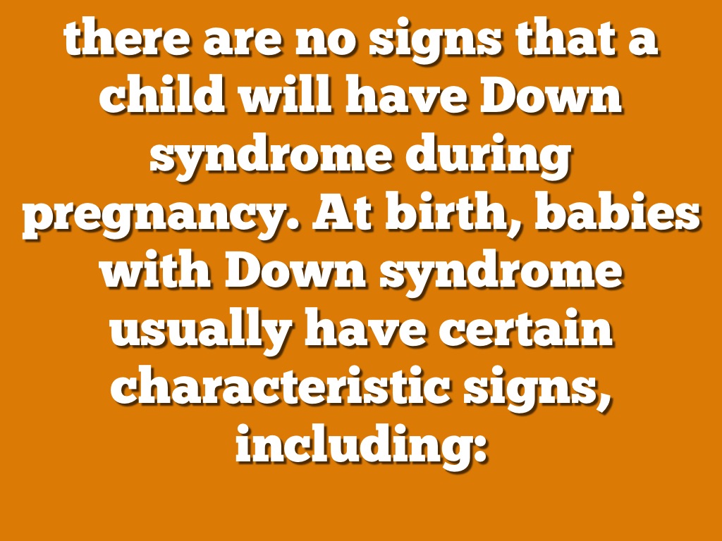 there are no signs that a child will have Down syndrome during pregnancy. At birth, babies with Down syndrome usually have certain characteristic signs, including: