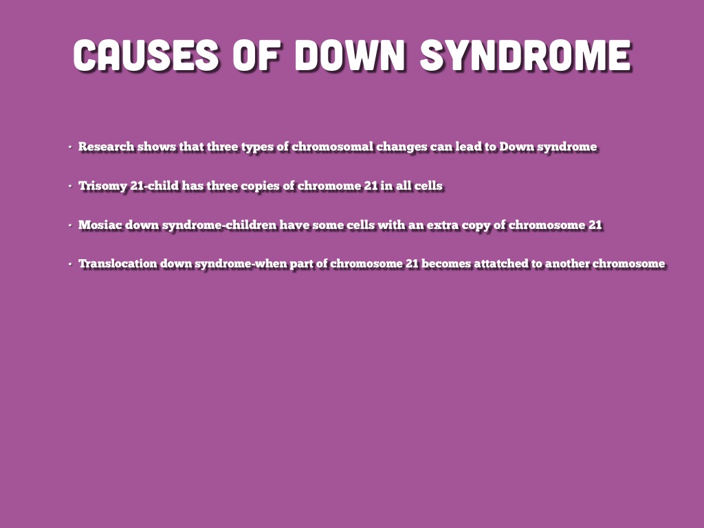 • Research shows that three types of chromosomal changes can lead to Down syndrome