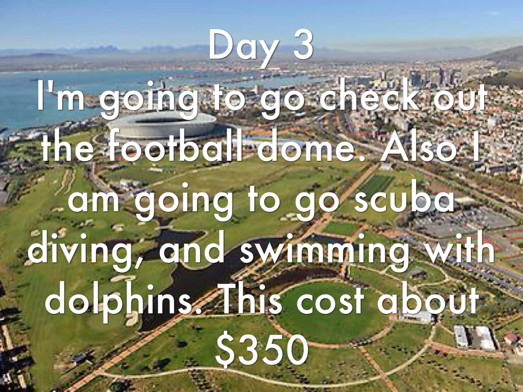 I'm going to go check out the football dome. Also I am going to go scuba diving, and swimming with dolphins. This cost about $350