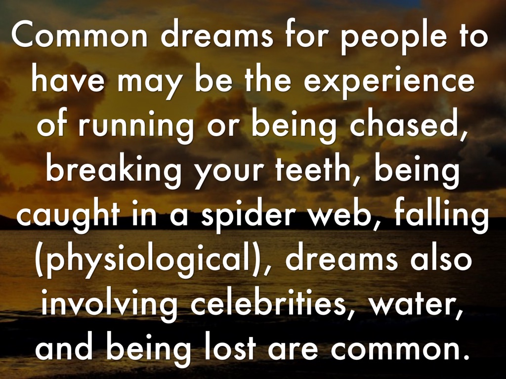 Common dreams for people to have may be the experience of running or being chased, breaking your teeth, being caught in a spider web, falling (physiological), dreams also involving celebrities, water, and being lost are common.