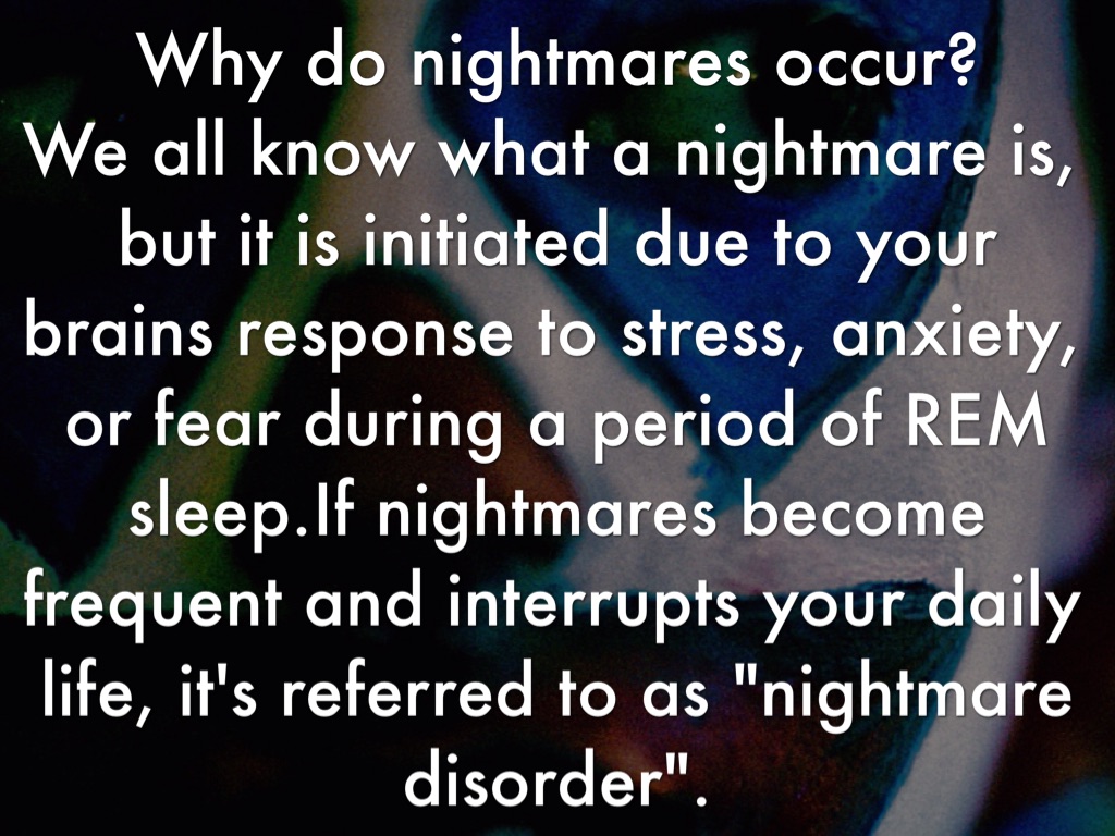 We all know what a nightmare is, but it is initiated due to your brains response to stress, anxiety, or fear during a period of REM sleep.If nightmares become frequent and interrupts your daily life, it's referred to as "nightmare disorder".